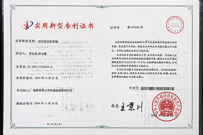 切石機(jī)環(huán)形帶鋸實(shí)用專利證書