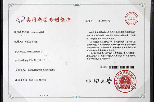 一種加熱模板實(shí)用專利證書