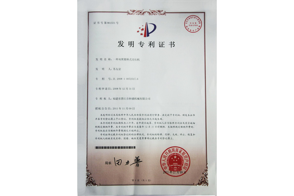 雙鎖緊橋式切石機(jī)發(fā)明專利證書