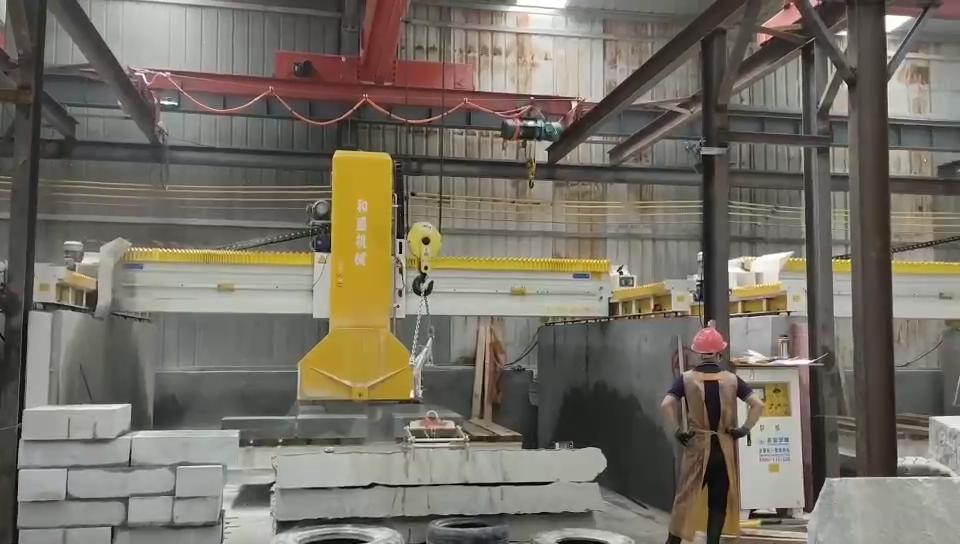 本機橫梁采用鋼制構造件, 強度高不易斷裂。整機重量重,切割平穩(wěn)、下刀量大、產(chǎn)量高。 橫梁切割行走導軌采用高精度線性軌道,機身升降結構采用大直徑四導柱(直徑120mm)液壓升降。配有液壓推動旋轉工作臺,大梁移動實現(xiàn)橫向分片。具有加工長度大,切割深度大,旋轉靈活,定位準確,剛度大,工作平穩(wěn)等特點。主機采用進口變頻器可實現(xiàn)切割速度的無級調(diào)速。適合大批量加工路沿石及高價值的墓碑石。